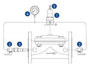 1-Pressure Sustaining Pilot Valve; 2-Ball Valves; 3-In-line Finger Filter; 4-Pressure Gauge; 5-Adjustment Bolt;